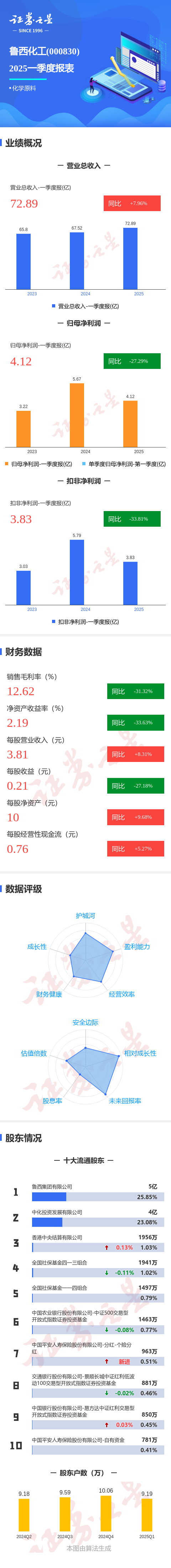证券之星消息,鲁西化工2025年一季报显示,公司主营收入72.9亿元,同比上升7.96%;归母净利润4.13亿元,同比下降27.3%;扣非净利润3.84亿元,同比下降33.81%;负债率46.73%,投资收益17.0万元,财务费用4883.18万元,毛利率12.62%。
